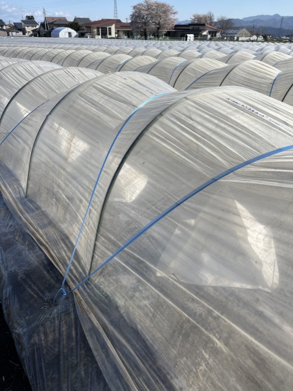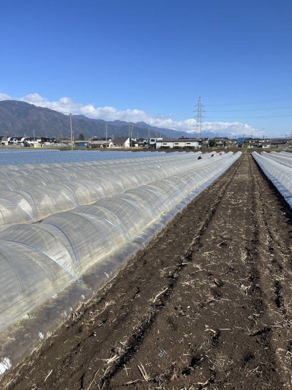 本日の作業は、計800m(100m×8通り)におよぶ定植と、苗を守る「ぼうし(ホットキャップ)」被せでした!